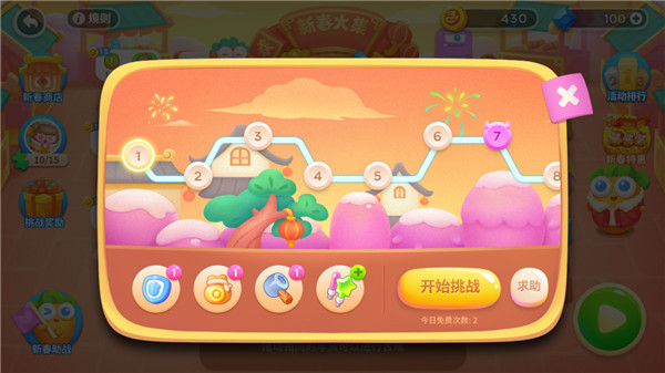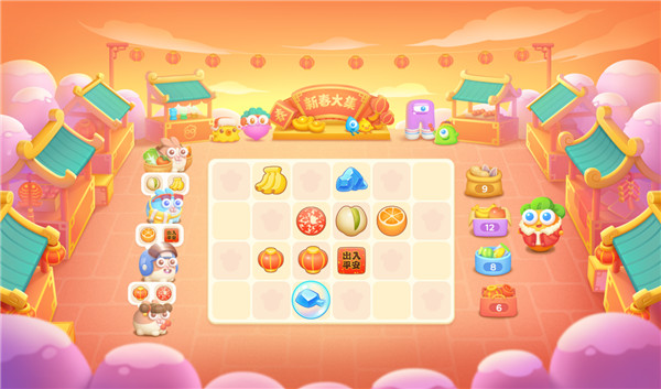 火爆出圈第一步,年货商品得备足!挑战活动关卡,将有机会获得水果、糖果、干果、和新年装饰品等。在「新春大集」活动中,可以挑战15个固定关卡和1个随机关卡,每天有2次免费挑战机会,免费的挑战次数会在每日24点刷新。