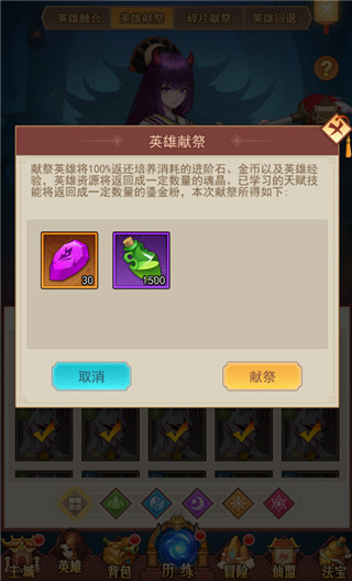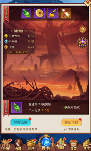 每通关1关会加成一次挑战奖励,奖励内容是金币、英雄经验。