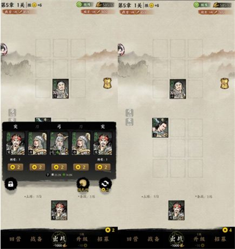 招募与上阵。进入主线关卡后,点击界面中的【继续】按钮即可开始进行关卡战斗。点击【继续】按钮后,即进入备战状态。备战状态会首先弹出招募窗(如下图一),主公需要根据自身所有拥有的军饷(沙盒资源)数量来招募对应的武将。招募后的武将出现在备战区(如图中马岱的所在位置),如果需要将该武将上阵,可以手动拖动武将卡片到对应的出战区(如图中张任所在位置),双击卡片会自动上阵该武将。点击【出战】按钮后开始战斗。战斗过程为全自动战斗,无法手动发动技能。