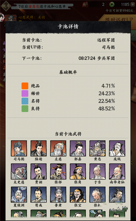 1、在这些卡池中,不同的人物都会有不同的品质,其中品质越好的自然就会越难获取了。而此处每个玩家还能设定一个心愿武将,在设定好之后,你们能够抽取到它的概率会更高一些。