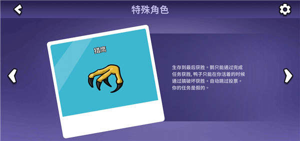猎鹰:生存到最后获胜。鹅只能通过完成任务获胜,鸭子只能在你活着的时候通过搞破坏获胜。自动跳过投票。你的任务是假的。