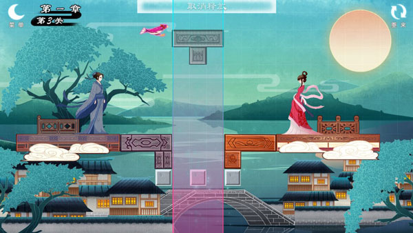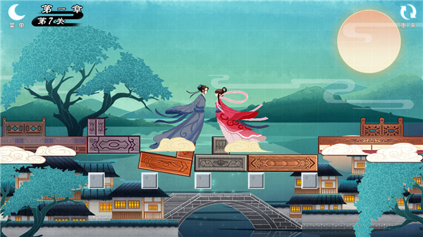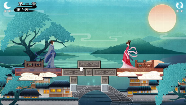 谜桥是一款非常新颖好玩的冒险解谜游戏,这是一个关于牛郎和织女的凄美爱情故事,相传古时牛郎与织女相恋,却为王母所拆,天帝仅允许他们每年七月七日(农历)相会,无数喜鹊也感其爱情的坚贞,飞身搭建鹊桥助其相会。谜桥游戏以大家耳熟能详的中国古代著名的民间爱情故事“牛郎织女”的作为原型,创新的将经典的“俄罗斯方块”元素与“牛郎织女相会”题材完美结合,在这里你的任务即是扮演喜鹊合理的利用有限的方块搭建破碎的桥梁,从而助力两者更好的进行相会。谜桥测试版同时也是一个关于爱情的游戏,唯美的画面、精致的风景,搭配古典的中国民族音乐,讲述的是各种各样的爱情故事。每一关都需要您发挥想象力和创造力去寻找一个合理的支撑点以解开“谜题”,每一关通关之后都会送您一句或温暖、或凄凉、或悲壮、或暧昧的爱情语录。谜桥画面制作非常的精细暖心,具备10大章节,100个小关卡供你挑战,创新独特的题材内容,略显烧脑的闯关玩法,感兴趣的小伙伴们快来挑战吧。