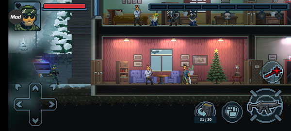最近玩了一款叫《破门而入:行动小队》的手游,感觉挺有意思的。游戏画面复古又有像素风,看起来特别精致,色彩也很鲜艳,一下子就被吸引了。玩法比较简单,像小时候玩的合金弹头那种横版射击,但内容很丰富,有超过40种武器可以选择,uzi冲锋枪、手枪、机枪等等,还有三种不同的模式:爆破、解救人质和室内突击,每种都挺刺激的。