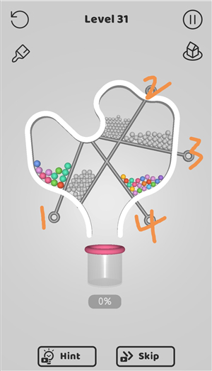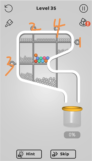 2、所有的球都必须进入管道…你能按正确的顺序把销子取出来吗?