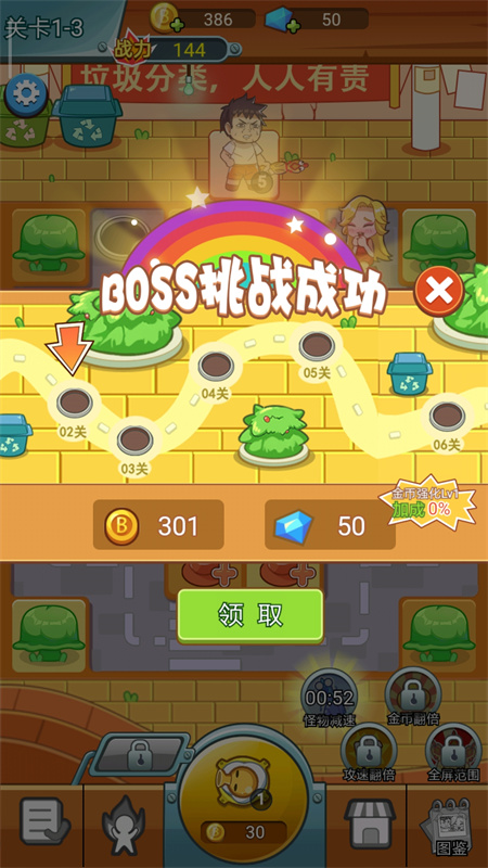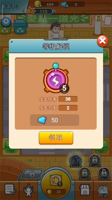 2、你需要不断的升级炮台等级加强炮台攻击力,才能更好的保护你的女神的安全。