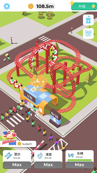 闲置过山车中文版(Idle Roller Coaster)是一款休闲模拟类游戏,清新简洁的卡通式画风,高清逼真的过山车形象,紧张而又不失欢快的背景音乐,在这里,玩家可以沉浸式体验到经营过山车游乐园的快乐。游戏玩法多样,在这里,玩家将担任过山车经营大亨,通过接待游玩的顾客来获取增长收益,在此期间你可以通过升级站台内的游戏速度、站台容量和队伍容量来提升整体的容纳量。同时你也可以通过升级票价、改进速度及车辆来改善你的过山车娱乐设施。另外,在游戏中,能够带给玩家真实的过山车的场景,而且现场还会有一些装饰物,如气球、冰淇淋车及其他丰富饰品,所以大家还在等什么,有喜欢的朋友欢迎来本站免费下载吧。