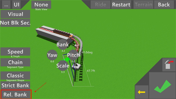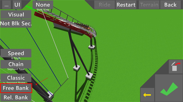4、点击"Rel.Bank"按钮,我们可以以地图或以前一节轨道为基准让轨道进行倾斜;