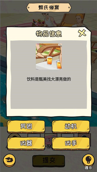 1、这是案件介绍,有一个小美遇害,需要玩家找到受害人的凶手、凶器、动机以及死因
