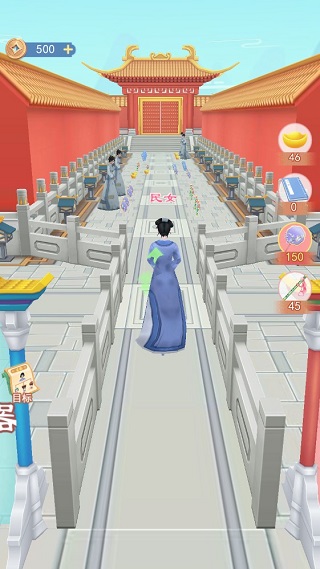 3、左右滑动开始游戏!游戏中的道路上随机掉落着元宝、书籍、色子等物品,滑动屏幕让小主收集物品提升地位。