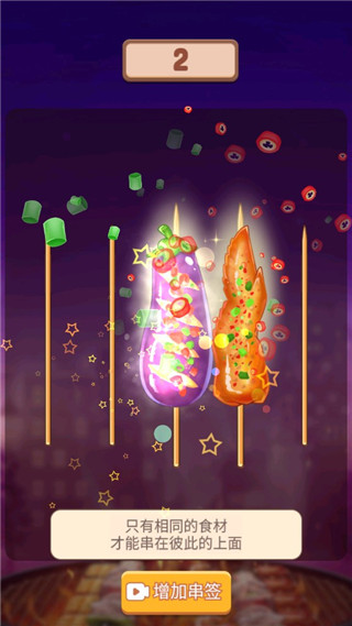 6、只有相同的食材才能串在彼此的上面,玩家可以增加串签;