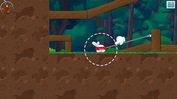 玩家需要控制飞镖绳子,把兔子武士拉向关押小动物的笼子,这样就可以解救小动物啦!