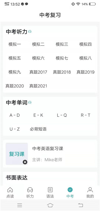 5、最后在中考界面,学生可以在这里复习模拟英语的听力及试题。