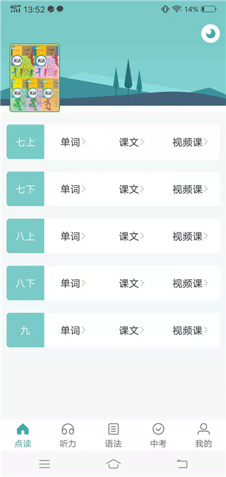 包含七、八、九年级的听力训练,配有高清发音,并且听力内容与教材紧密结合、由简到难。