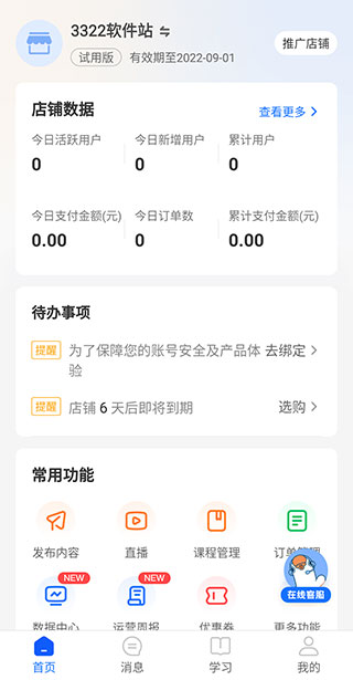 小鹅通商家版App是一款专为旗下商家提供技术支持的服务平台,该软件以知识产品与用户服务为核心,可以帮助商家一分钟搭建自己专属的知识店铺,满足内容变现、营销获客、用户管理需求,全面构建知识付费闭环。同时它也能够帮助商家快速创建体验店铺,或者进行店铺的经营管理,随时随地查看店铺经营数据,管理商品、订单、用户和反馈信息。