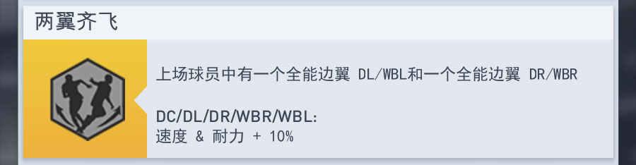 上场球员中有一个全能边翼DL/WBL和一个全能边翼DR/WBR。DC/DL/DR/WBR/WBL:速度和耐力+10%。