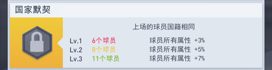 上场的球员国籍相同。6个球员:球员所有属性+3%;8个球员:球员所有属性+5%;11个球员:球员所有属性+7%。