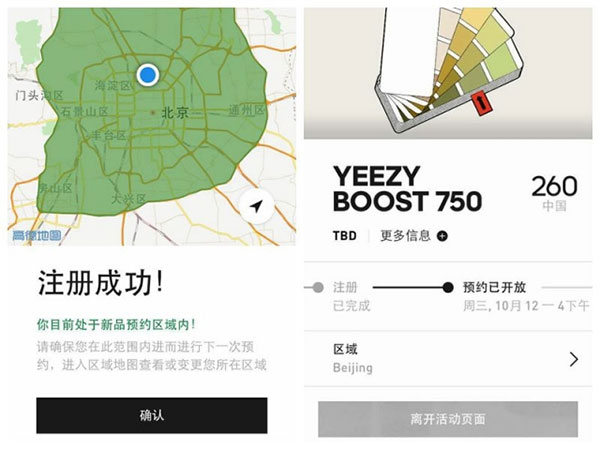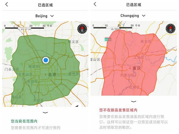 6、在软件预约球鞋的时候,你必须在公布的相关发售地区范围内才可以,如果超出范围,则不能进行预约。小编在本地及非本地进行了测试,结果如图。