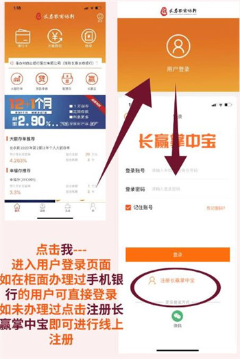 2、点击我---进入用户登录页面如在柜面办理过手机银行的用户可直接登录,如未办理过点击注册长赢掌中宝即可进行线上注册