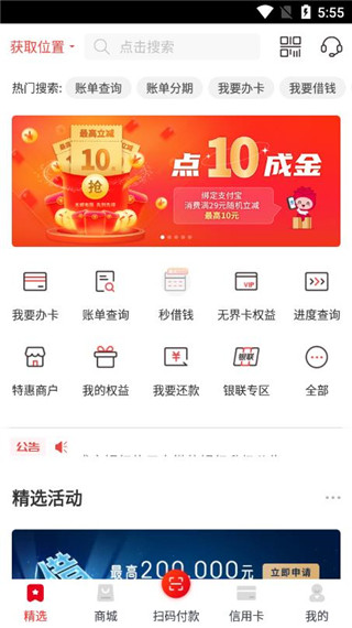 首页呈现精选营销活动展示、提供热门活动的快捷入口,多种惊喜卡权益,线下特惠商户享消费满减优惠,让您及时方便了解盛京银行信用卡优惠信息。
