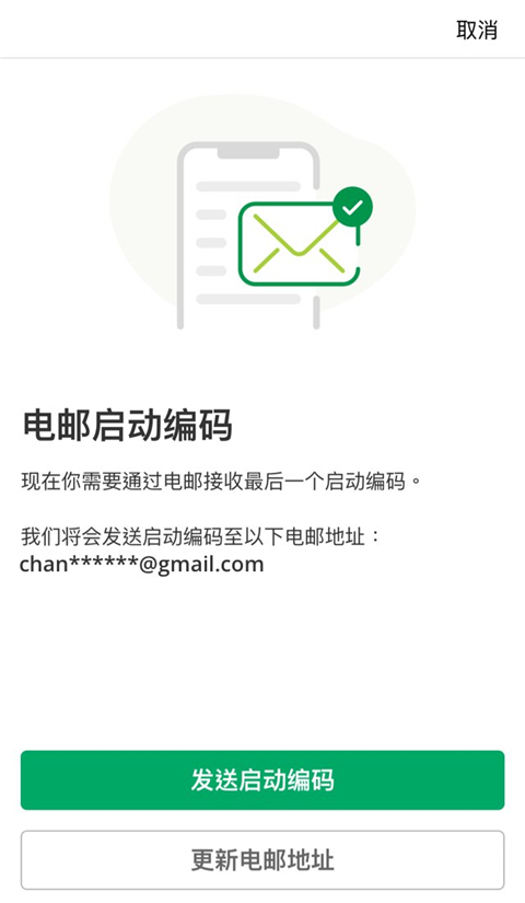 6、点击"发送启动编码",再跟据页面指示输入你通过电邮地址收到的一次性电邮验证码后继续下一步。