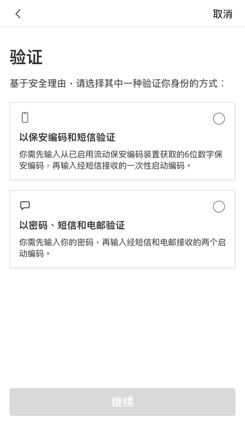 3、选择其中一个方式验证身份。选择后按"继续"。之后的步骤将根据选择"使用密码、短信及电邮验证"作示范。
