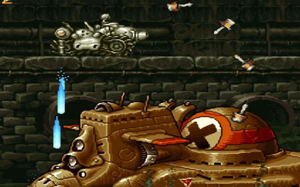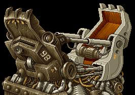 玩家首次变成胖子就是在《合金弹头2》的第四关。很多玩家就是利用胖子的形态对付这个BOSS的。玩家必须先将他的发射器全都打烂,加农炮就会出现。