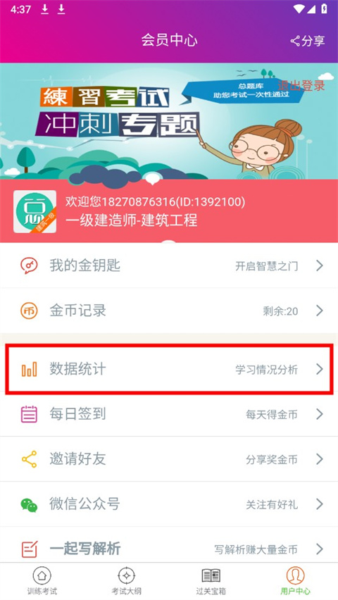 2、点击数据统计,查看学习情况分析;