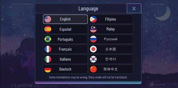 1、在本站下载安装好加查同人圈游戏后,打开进入,点击右下角【Language】切换语言。