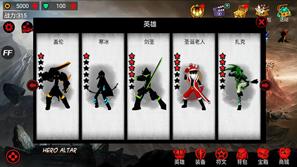 多种火柴人英雄任君选择,盖伦、寒冰、铁拳、刀妹、子龙、武僧,暗影忍者等。