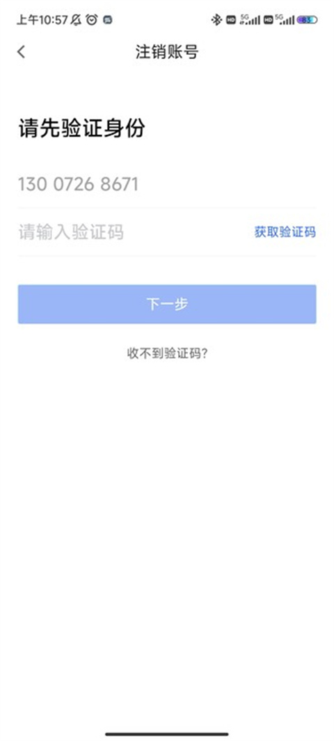 4、注销账号需要验证身份,获取验证码点击下一步;