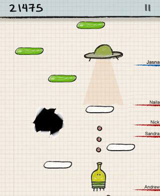 目前涂鸦跳跃不仅支持单机游戏,而且还可以通过Wifi链接与其他玩家进行同来PK一较高下。同时游戏的分数还将在排行榜上得到显示。游戏还提供了完整和传统两种模式,并且用户还可以调整排行榜的显示设置。除此之外,玩家开可以在选项设置界面进行音效开关等功能设置。