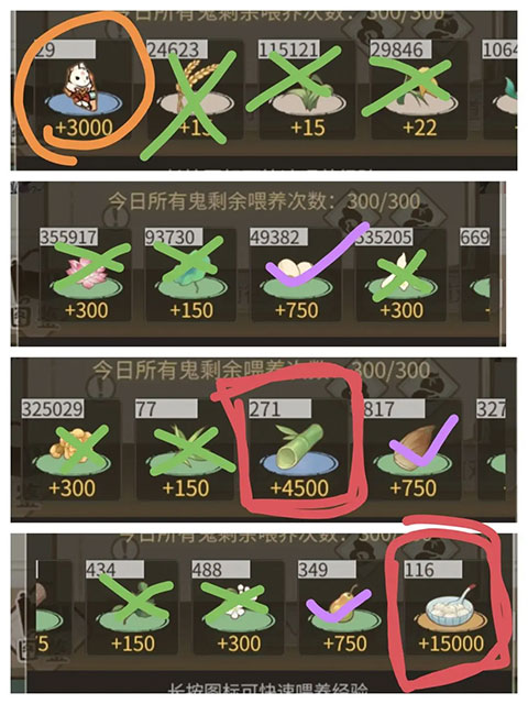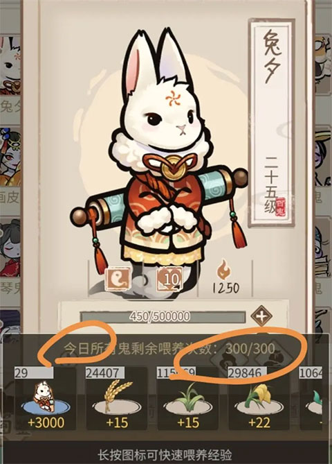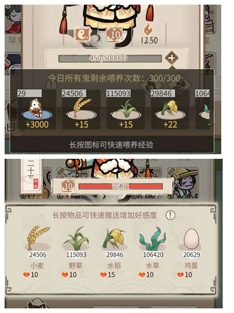 在开始提升一个鬼的等级值之前,先要把好感度拉满(喂一些多余材料就可以了)建议喂猪粪(话说这是从内测流传下来的传统吗),好感度可以加等级值送礼物的数值加50%,比如一个节日汤圆加1万经验,如果你你好感度满值就是15000的经验,数值还是相当可观的。