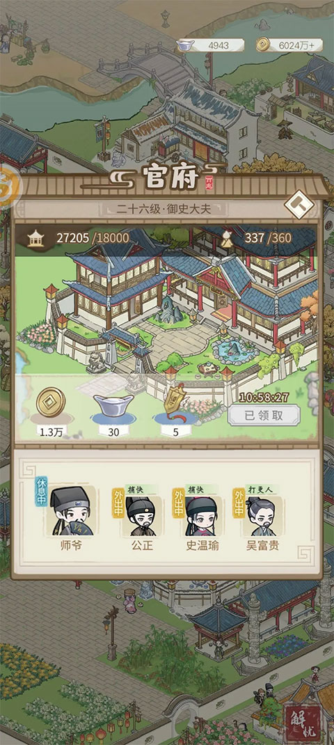 官府的等级越高领取的俸禄就越高,花的官府是26级可以领到30个银元宝。