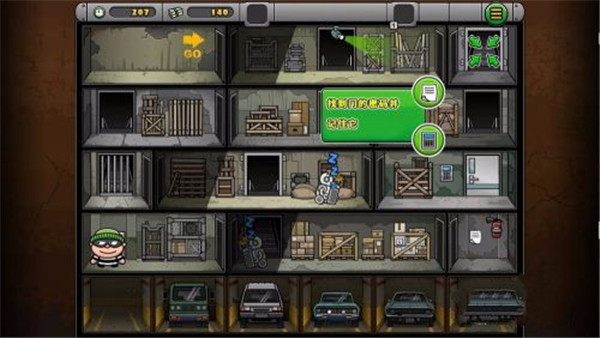 1、下载并安装本站提供的神偷鲍勃4,打开进入游戏点击屏幕就可以进行移动,当到了在门口,会显示离开的图标,点击图标,就可以到达另外一个地方,如图所示