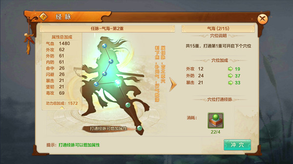 每一套经脉都有15重,需要打通第一重才能开启下个穴位。也正因为如此,在提升的时候就需要一定的计算了。