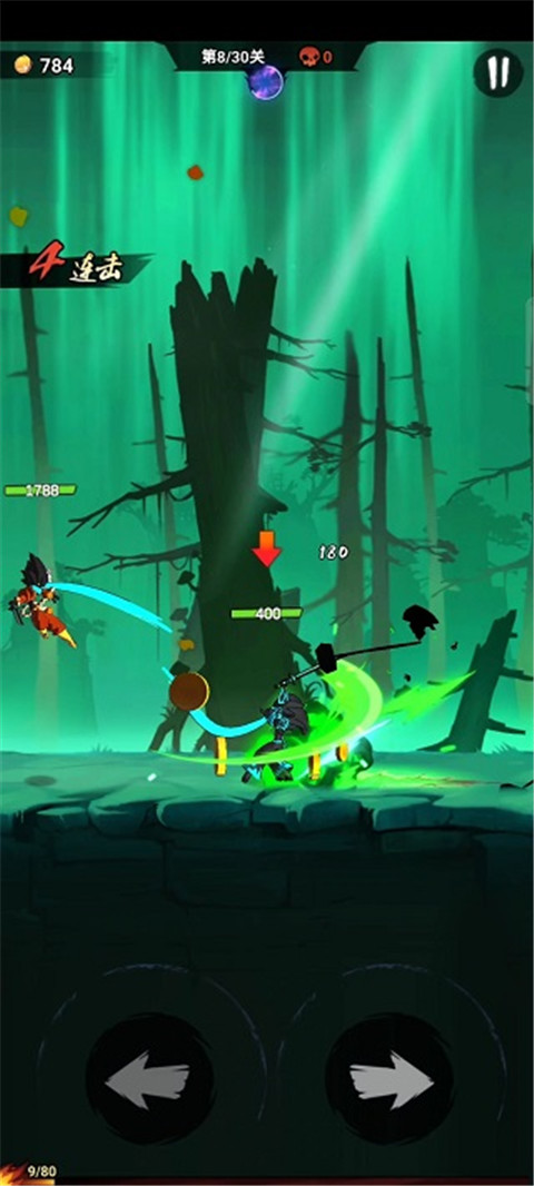 操作左右两个按键,自动攻击敌人,在确保自己不被杀死的同时,一直努力向上层行进即可。根据左右两个按键的不同组合,我们可以发出不同的招式变化,以应对不同的敌人。