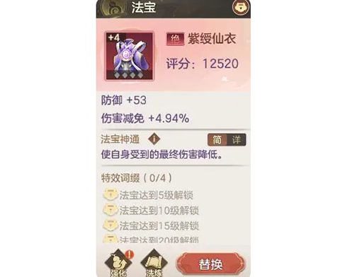4、法宝:给予角色额外的主动技能,可分为攻击类法宝、治疗类法宝、防御类法宝以及Debuff类法宝,每一类法宝都有其独特的效果。玩家可以根据英雄类型和战斗需求选择不同类型的法宝,以提高战斗的灵活性和多样性。