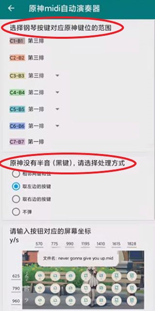 在后面可按照midi音乐的情况,调整“选择钢琴按键对应原神键位的范围”以及“原神没有半音(黑键),请选择处理方式”这两个选项。