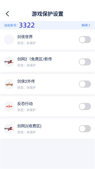 2、激活成功后,在首页点击【游戏保护设置】按纽,选择需要开启游戏保护的游戏,目前游戏密保服务仅支持:《剑侠世界》、《剑网2-免费区》、《剑侠2外传》。