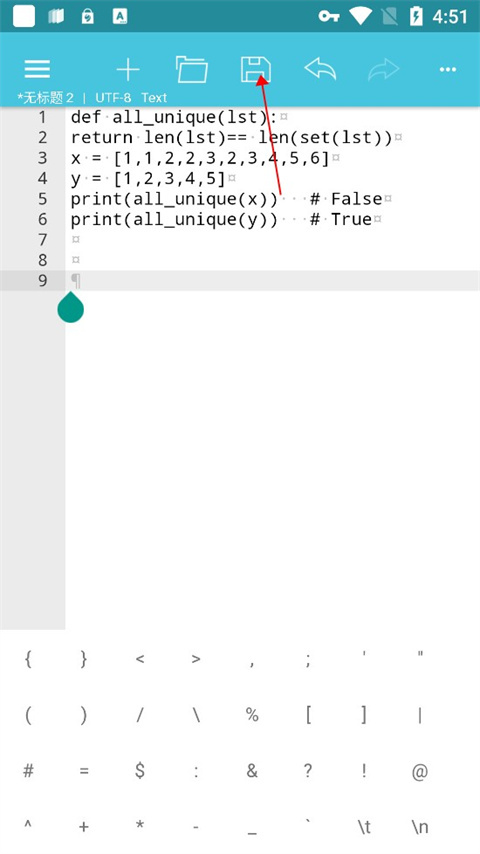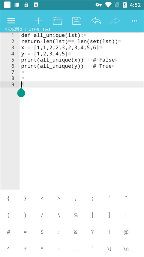 7、方便的工具栏,你可以快捷进行文件新建、打开、保存、另存为、撤销/重做、一些常用符号、返回上次编辑位置等等;