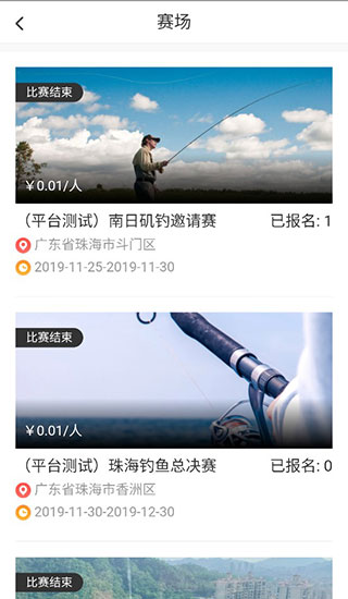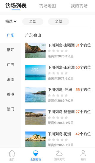 1、海钓大师app拥有钓场、秀场、赛场、资讯、潮汐、学堂、人物、我的功能。