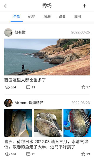 4、进入秀场,可以看到各个钓友发的图片和文章,同时我们也可以发布自己有趣的事情。