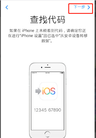 在安卓设备上,打开“转移到 iOS”App 并轻点“继续”。阅读显示的条款和条件。轻点“同意”以继续,然后轻点“查找代码”屏幕右上角的“下一步”。这个时候,两台手机尽量靠近点。等待代码