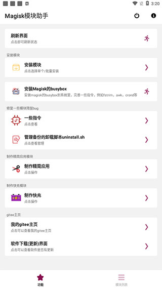 Magisk模块助手是一款专门为喜欢“搞机”人士捣鼓出来的专业搞机助手工具。说到搞机,相信很多朋友对magisk面具就不陌生了,而小编今天为大家推荐的这款Magisk模块助手APP,在功能上其实与magisk面具基本类似,而且用法,界面更简单,功能还多些。Magisk模块助手同样是100%开源免费,能够帮助大家一键进入手机FastBootn模式,老设备也能支持,亲测各种刷机包都能快速输入,还能帮助大家修改手机品牌,型号,设备代码,Android版本及序列号等,并且其安全性也是同样优秀的,能在不篡改分区的情况下修改系统,提供了谷歌安全,企业/银行系统完整性检查和游戏篡改检查,可切实帮助用户的隐私安全,反正,会“搞机”朋友用起来挺爽的,有需求的用户不妨下载体验。