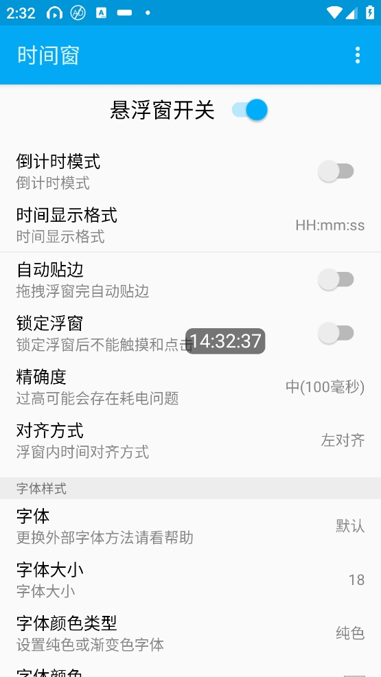 时间窗app是一款专为安卓用户设计的时间悬浮窗软件,操作简单,界面清爽简洁,体积小巧,几乎不占内存。它可以把时间悬浮显示在手机屏幕上,让用户随时查看时间,无论是在全屏还是其他模式下使用都很方便。