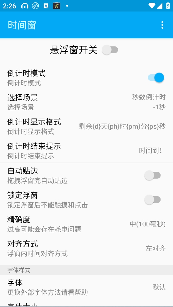 除了基本功能外,时间窗还提供了多种自定义选项,比如调整悬浮窗的大小、样式、位置、透明度、圆角、颜色等,让用户体验个性化的设置。软件亮点包括不占内存、支持多种时间显示格式和位置对齐方式、高精确度设置以及倒计时功能等。