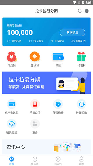 1、下载进入拉卡拉易分期app,在首页中,申请获取额度,方便用户还款;