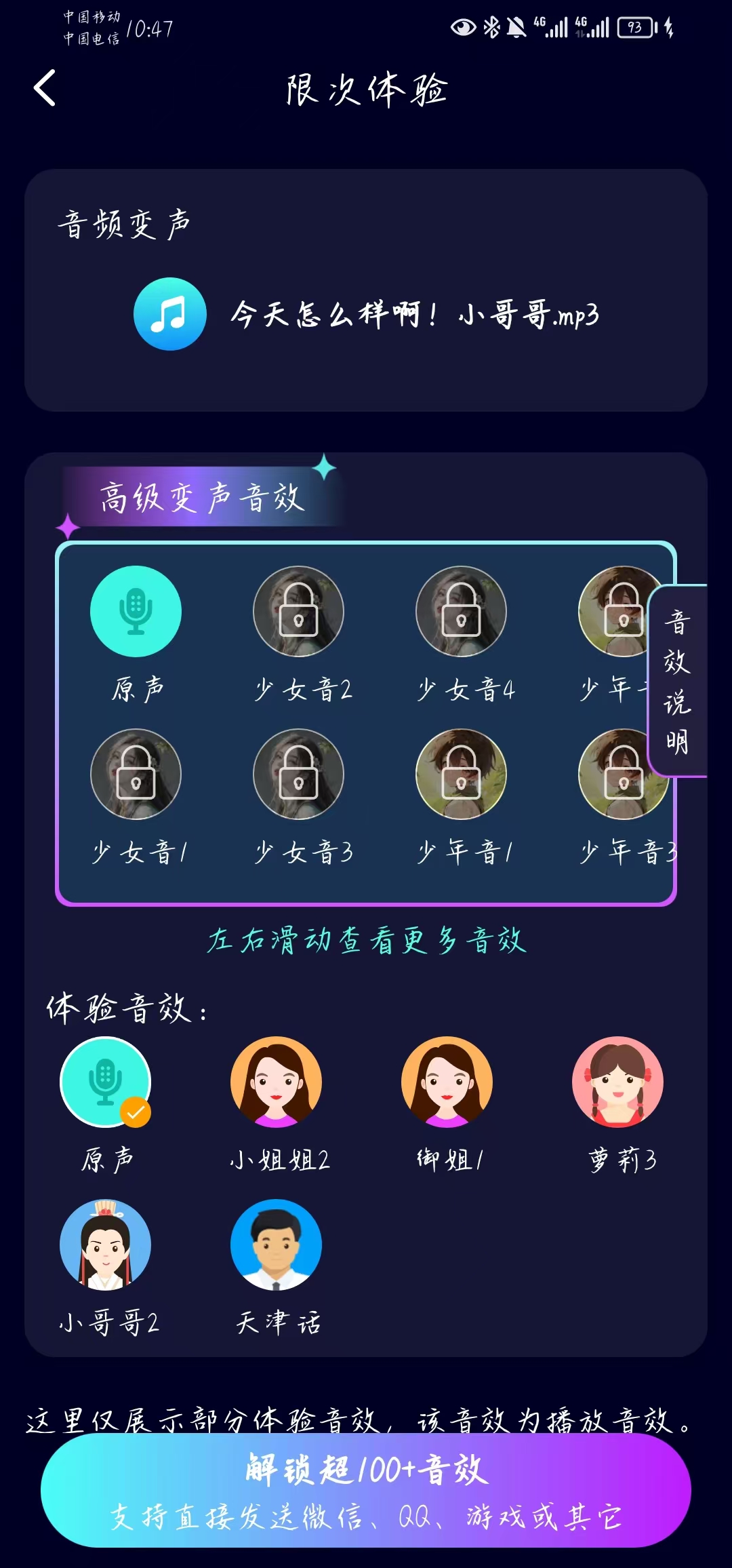 2、多种变声效果可选:萝莉、大叔、小孩、惊悚、搞怪、空灵、山谷、大堂、教室、现场、小黄人、慢吞吞...... 变声时只需轻轻一点,让你成为自带BGM的潮人