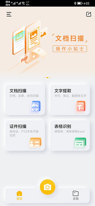 2、打开相机后,可以选择证件扫描、文档扫描、文字提取、表格识别,同时支持拍单页和多页,还可以从相册里导入。