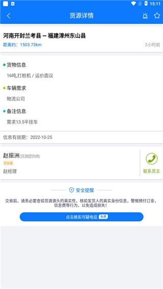5、用户点击自己感兴趣的货源金科进入页面查看详细信息,直接联系货主。